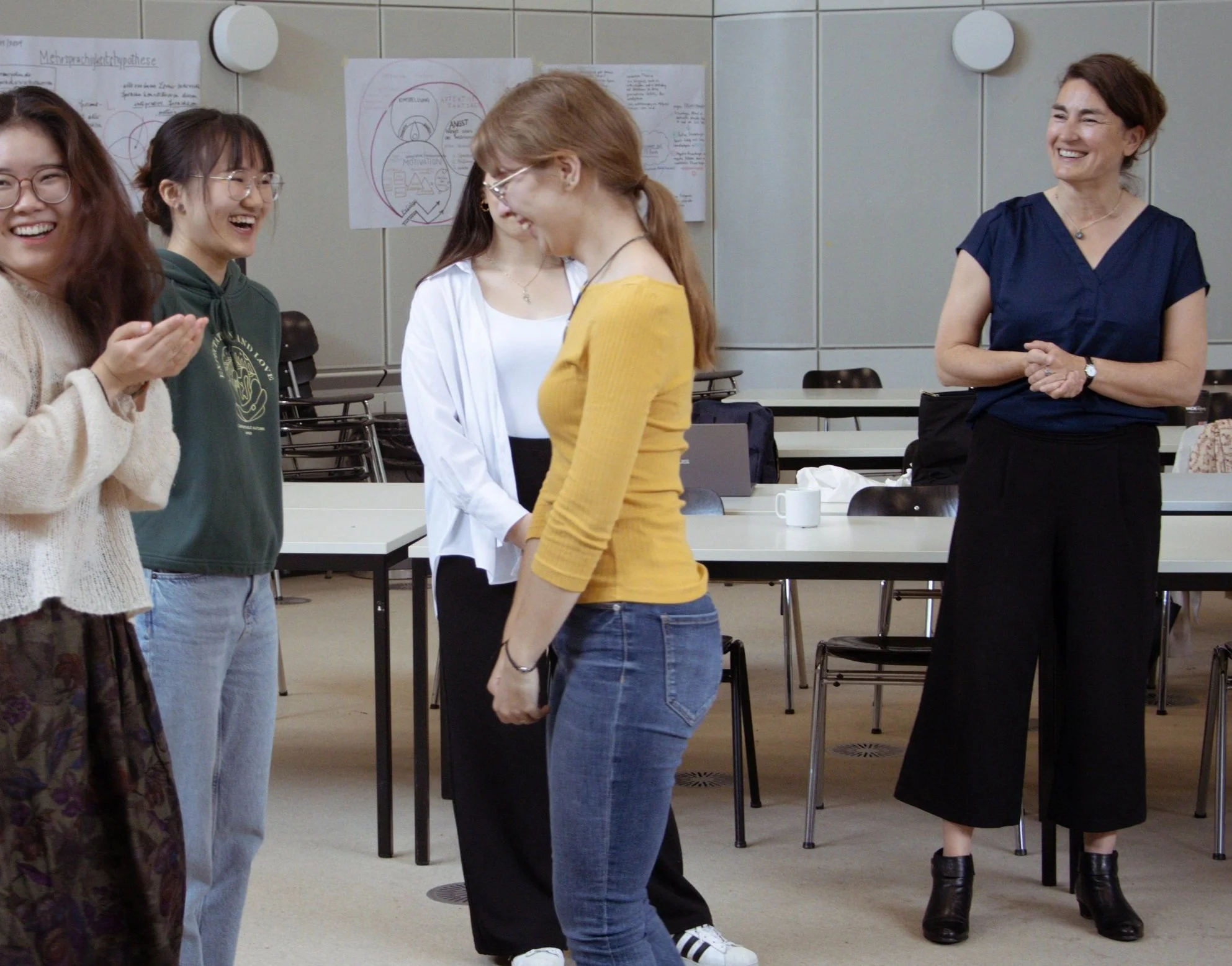 2019 promovierte ich, nach wirklich längerer Überlegung, da ich mich eher als Praktikerin, denn als Theoretikerin verstehe, zum performativ-ästhetischen Unterrichtsvorgehen an der FU Berlin bei Prof. Almut Hille und Prof. Manfred Schewe. Das Verfassen meiner Doktorarbeit bedeutete für mich eine intensive Auseinandersetzung mit dieser Thematik und vor allem mit meinem eigenen Kurs. Ich lernte dieses lebendige Miteinander im Kurs, die gute Atmosphäre und mein eher intuitives Arbeiten in Worte zu fassen und zu begründen. Meine Doktoreltern, so muss ich sie nennen, waren für mich unglaubliche Coaches, die mich dahin gebracht haben, genauer hinzuschauen, immer wieder zu hinterfragen und konkret zu werden. Dadurch hat sich mein Blick und meine Wahrnehmung erweitert und ich habe nun deutlicher vor Augen, inwiefern Theaterspiel einen positiven Effekt auf den Sprachlernprozess hat.